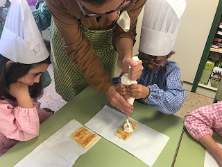 ajudants. Es talla l’hojaldre en trossos i cada infant decora el seu al gust